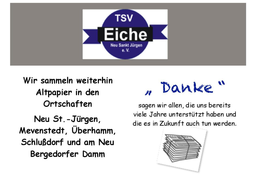 Unsere Sportler*innen sammeln an jedem ersten Samstag (Werktag) im Monat, bei Wind und Wetter, Altpapier im unten Einzugsgebiet. Der Erlös kommt der Jugendarbeit des Vereins zugute. Selbstanlieferer können ihre Kartons, Zeitungen und Zeitschriften (ebenfalls nur gut verpackt oder verschnürt) im Gewerbepark Neu St. Jürgen abgeben. In der Jan Weber-Straße stehen die Container für Selbstanlieferer*innen an der gewohnten Stelle.